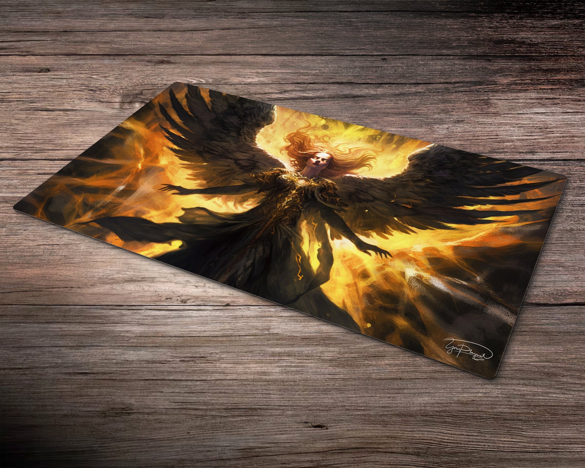 This captivating playmat features a breathtaking art of an angel descending from the heavens, her presence radiating with authority and power. Immerse yourself in the awe-inspiring scene as she intervenes with divine judgment.
