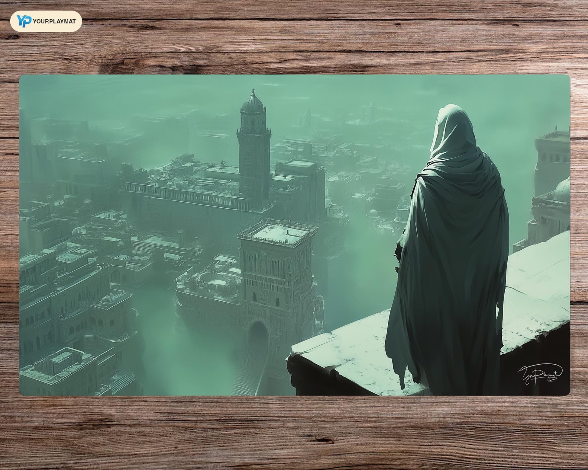 Dive into a world where every detail of your gaming setup resonates with your passion for adventure and strategy. The right playmat doesn’t just support your deck; it sets the tone for every move you make. Forget the uninspired, one-dimensional surfaces—your game deserves a canvas that echoes the depth and intrigue of your favorite realms. Our designs, drawing inspiration from the haunting beauty of ancient, mist-shrouded cities and the solitary figures that guard them, ensure your playmat isn't just an accessory but the heart of your gaming experience. Let your mat be the gateway to a world where every match feels legendary!