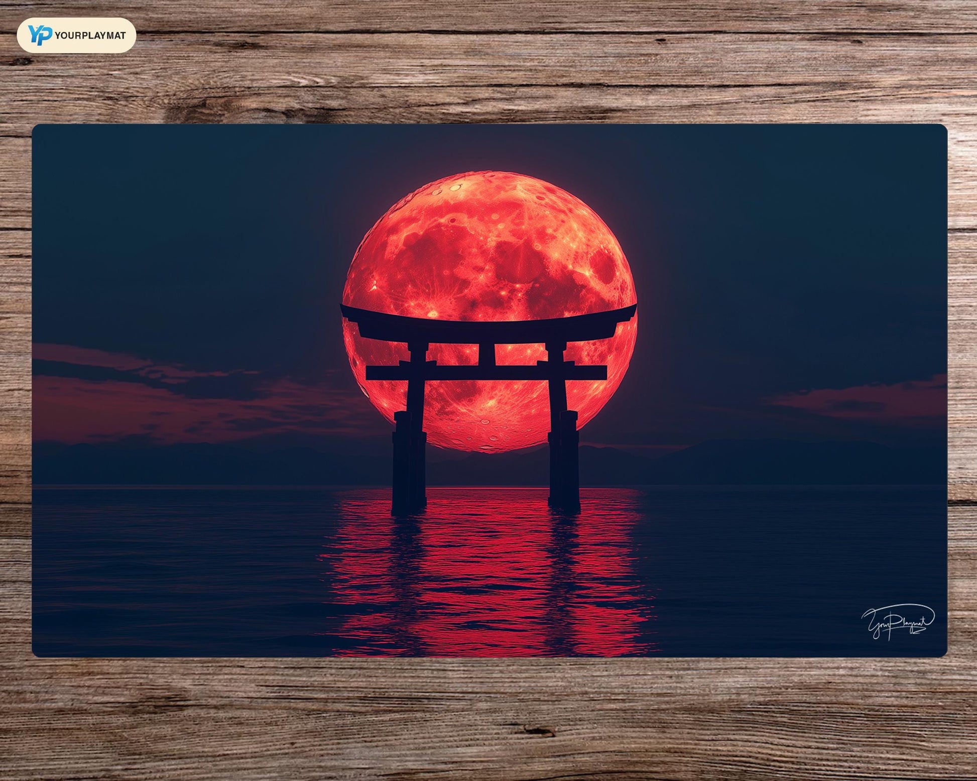 Beneath the ominous glow of a blood-red moon, the Crimson Horizon playmat transports your gaming setup into a world of dark beauty and mystical power. The right playmat is more than just a surface for your deck; it’s the gateway to a realm where the horizon blazes with fiery light, casting deep shadows across a tranquil sea. Say goodbye to ordinary, uninspired designs—your game deserves a canvas that captures the intense contrast of the glowing moon and the dark waters beneath it. Our designs, inspired by the haunting allure of a crimson-lit sky and the serene yet powerful presence of the torii gate, ensure your playmat becomes the heart of your gaming experience. Let your mat be the portal to a world where every match feels like a journey through a land bathed in the eerie light of the Crimson Horizon!