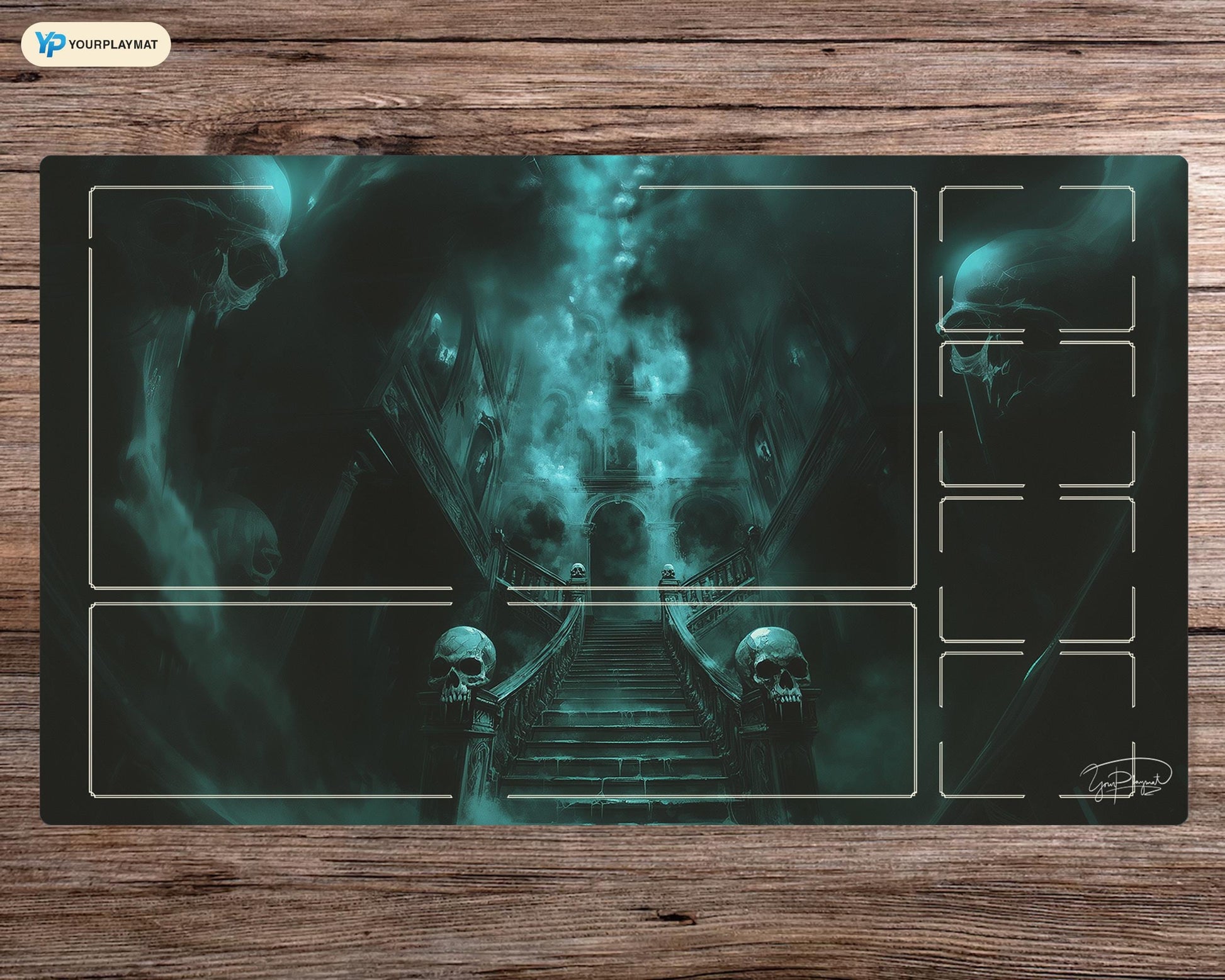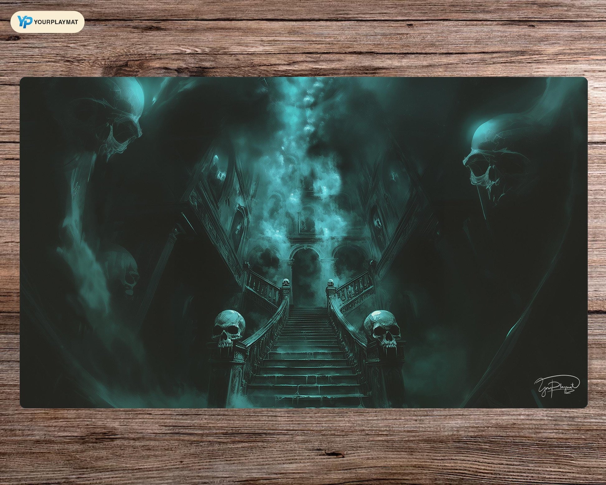 Step into the ominous world of Gloomshroud Manor with a playmat inspired by the dark and mysterious realm of DuskMourn. Every inch of your gaming setup will be cloaked in the eerie atmosphere of this haunted estate, where shadowy halls stretch into the unknown and foreboding staircases lead to secrets best left undiscovered. This playmat is more than just a surface for your deck; it’s the threshold to a world steeped in dark magic and hidden perils. Say goodbye to ordinary, uninspired designs—your game deserves a canvas that captures the chilling essence of DuskMourn, where every shadow whispers a warning. Our designs, inspired by the spectral figures and haunting architecture of Gloomshroud Manor, ensure your playmat becomes the soul of your gaming experience. Let your mat be the doorway to a world where every match feels like a descent into a mysterious and perilous darkness!