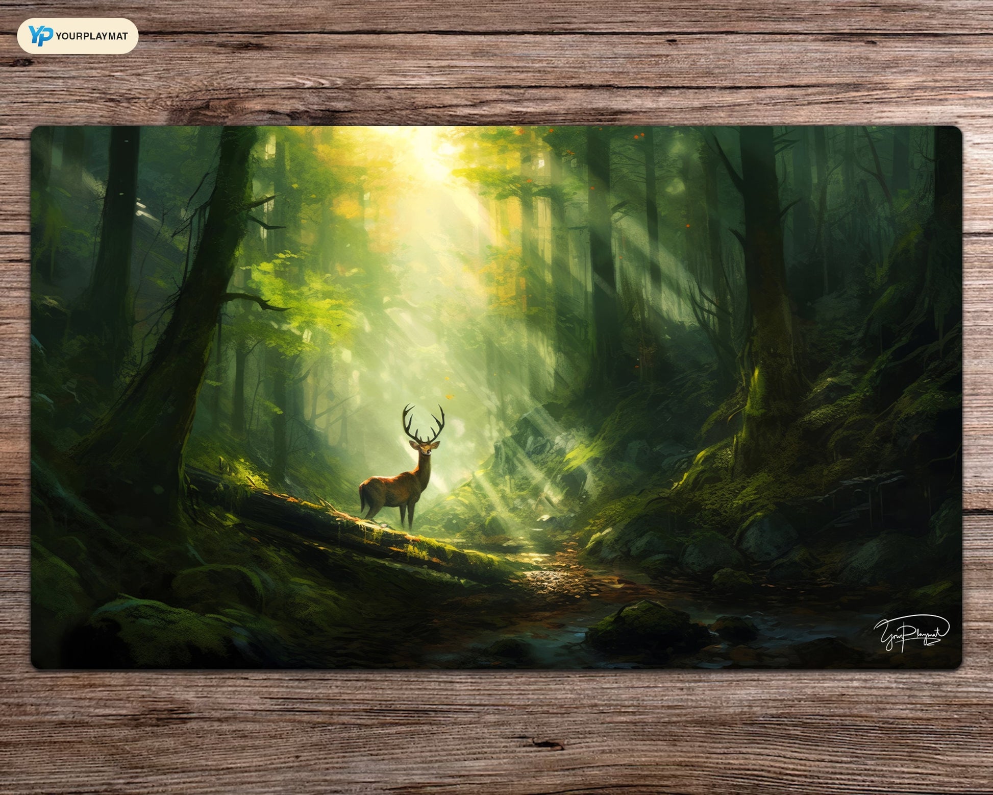 This captivating playmat features a breathtaking art of a serene forest, where ancient trees stand tall and a gentle ray of light illuminates the scene. At the center of this enchanted forest, a majestic deer basks in the ethereal glow, creating a moment of pure magic.