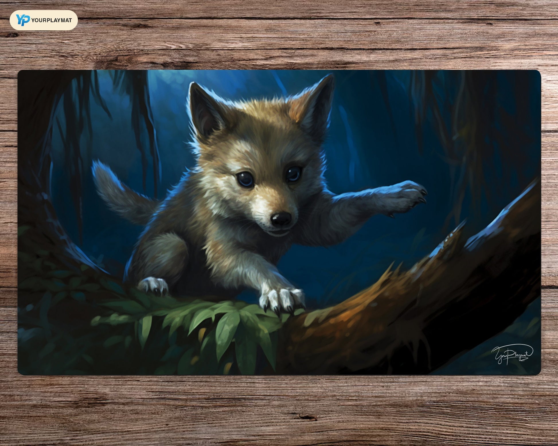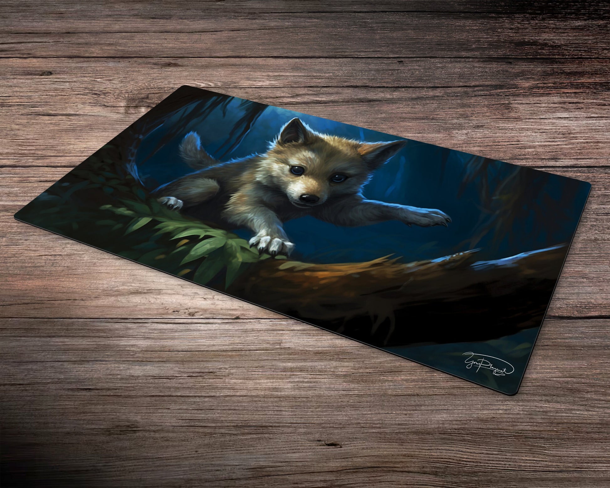 A captivating artwork of a young wolf pup in a natural setting. The intricate details of the fur, the piercing eyes, and the playful demeanor of the pup come to life on this stunning playmat.